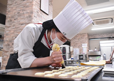 3年制の食&マネジメント科では、製菓・製パン・調理・カフェの基礎から応用までじっくり学び、まずはレシピ通りに作品が作れるチカラを身に付けます。